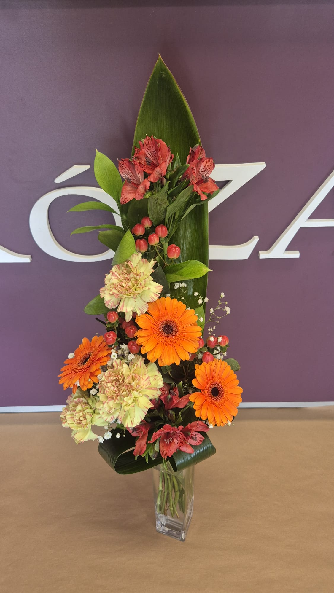 Kytice obsahuje: Alstromerie. Karafiát, Hypericum. Germina, zeleň
