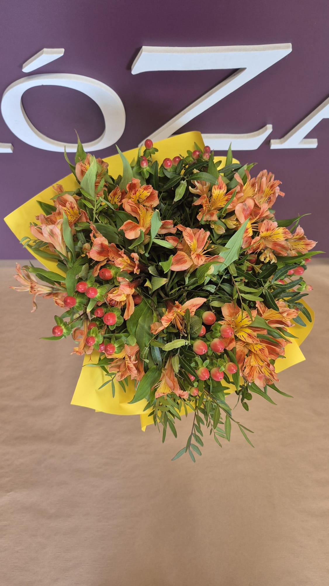 Kytice obsahuje: Alstromerie, Hypericum, zeleň